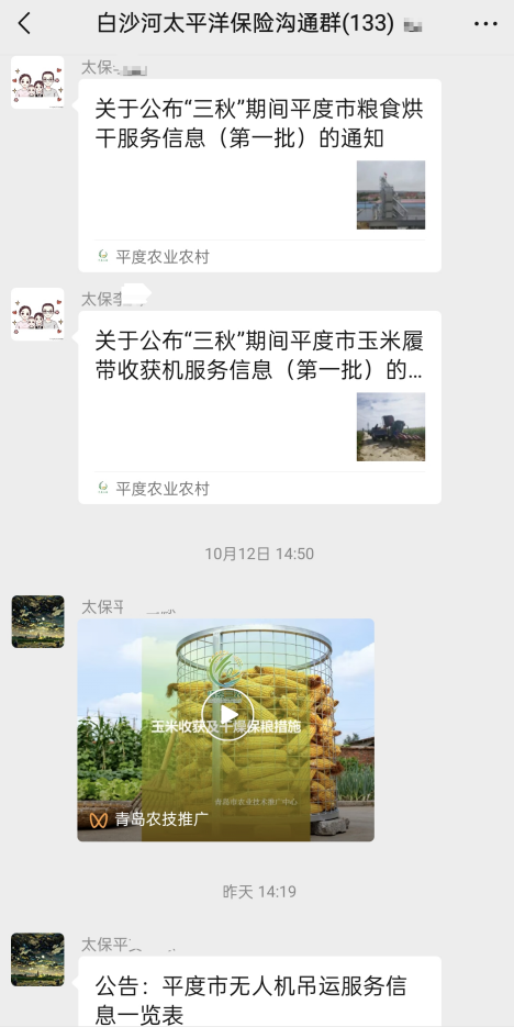 为应对复杂天气,太平洋产险青岛分公司建立“气象预警+农技指导+信息共享”的多维预警体系:一方面实时对接青岛市气象局,将干旱、降雨、大风等灾害预报第一时间通过农户微信群等渠道传递;另一方面,在青岛市农业农村局《科学应对秋汛,玉米收获分类施策》等业务知识的指导下,公司制作并转发《秋粮抢收烘干指南》等系列长图及推文,确保防灾提示覆盖投保群体。
