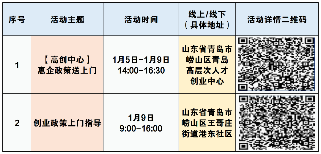 1月份,“青创四季”之暖冬行将开展包含创业指导、人社政策宣讲、技术交流等创业服务活动,详情可扫描下方活动二维码查看,欢迎有意向和需求的创业者积极报名参与。
