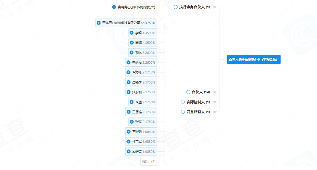 解析股权穿透图,青心创新为青岛元德众允大股东,持股比例达68.48%。此外,李超、高博、孙琳、高福学、张永利、王智鑫等13名自然人合计持有31.53%股权。