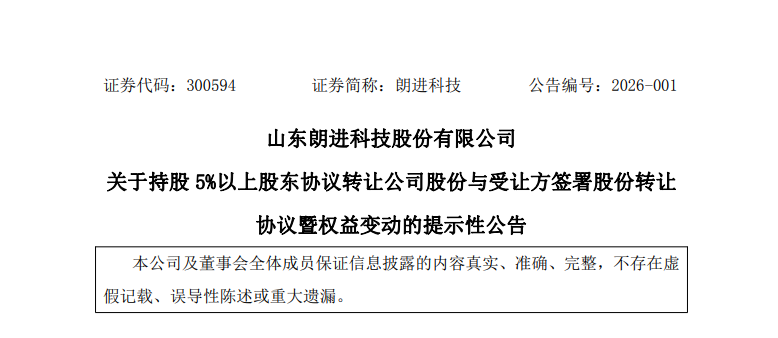 2026年1月7日,朗进科技披露,股东浙江经建投与青岛元德众允于2025年12月31日签署《股份转让协议》,浙江经建投将其所持有的公司460万股(占公司总股本5.0069%,占剔除公司回购账户股份后总股本比例约为5.16%)无限售流通股以18.54元/股的价格转让给青岛元德众允,股权转让总价为8528.4万元。
