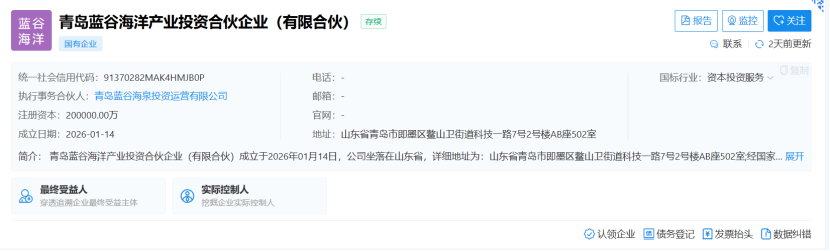 天眼查显示,青岛蓝谷海洋产业投资合伙企业(有限合伙)近日正式成立。