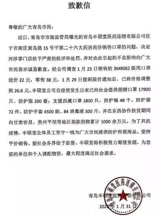 近日,青岛市市场监管局根据群众反映的丰硕堂药店高价销售口罩的问题,对丰硕堂进行了调查,发现其存在哄抬价格违法行为。