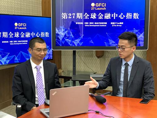 第27期“全球金融中心指数”报告发布会直播现场,(左一)为余凌曲图片来源:中国(深圳)综合开发研究院