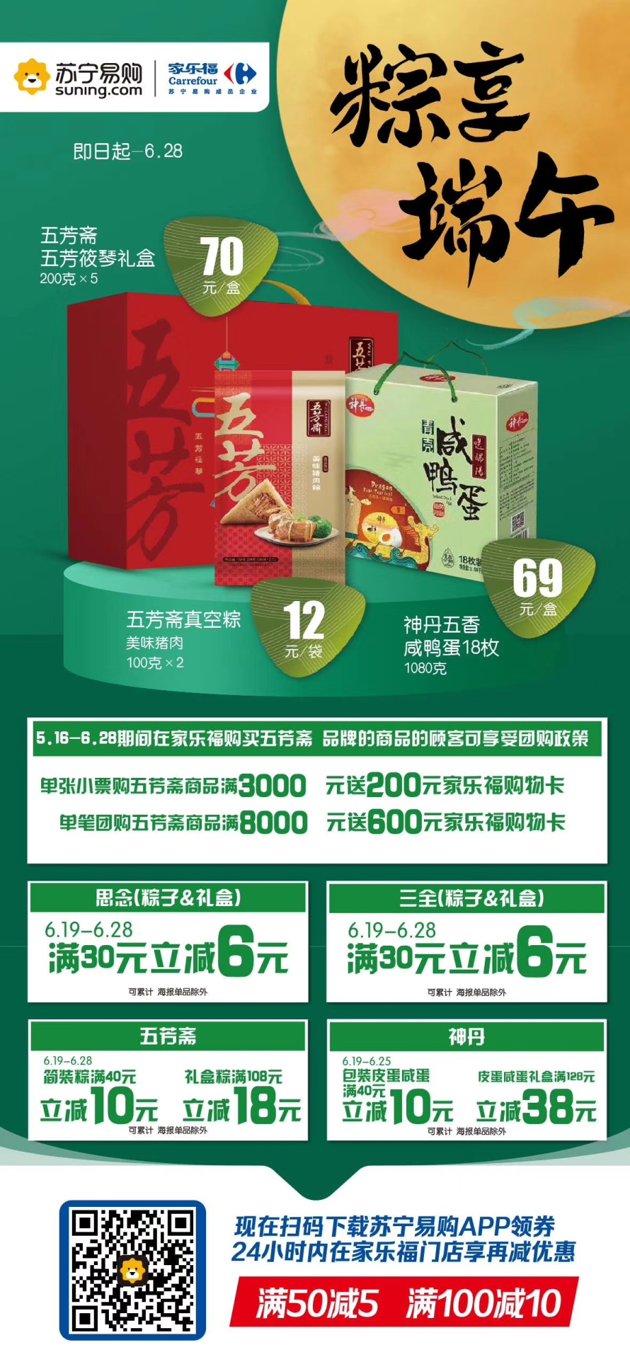 据悉,家乐福此次端午福利多多。即日起至6月28日期间,顾客凡购买或预定五芳斋品牌商品(五芳斋简装粽及礼盒)即可享受团购福利政策:单笔团购满3000元送200元家乐福福卡、满8000元送600元家乐福福卡。同时,思念、三全、雨润等品牌粽子及礼盒可享满30元立减6元优惠;五芳斋品牌则可享简装粽满40元立减10元、礼盒粽满108元立减18元;神丹包装皮蛋咸蛋满40元立减10元、礼盒满128元立减38元等优惠。