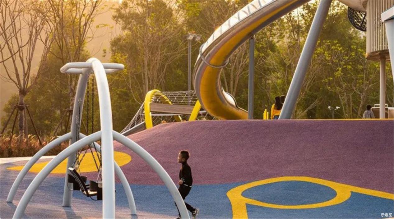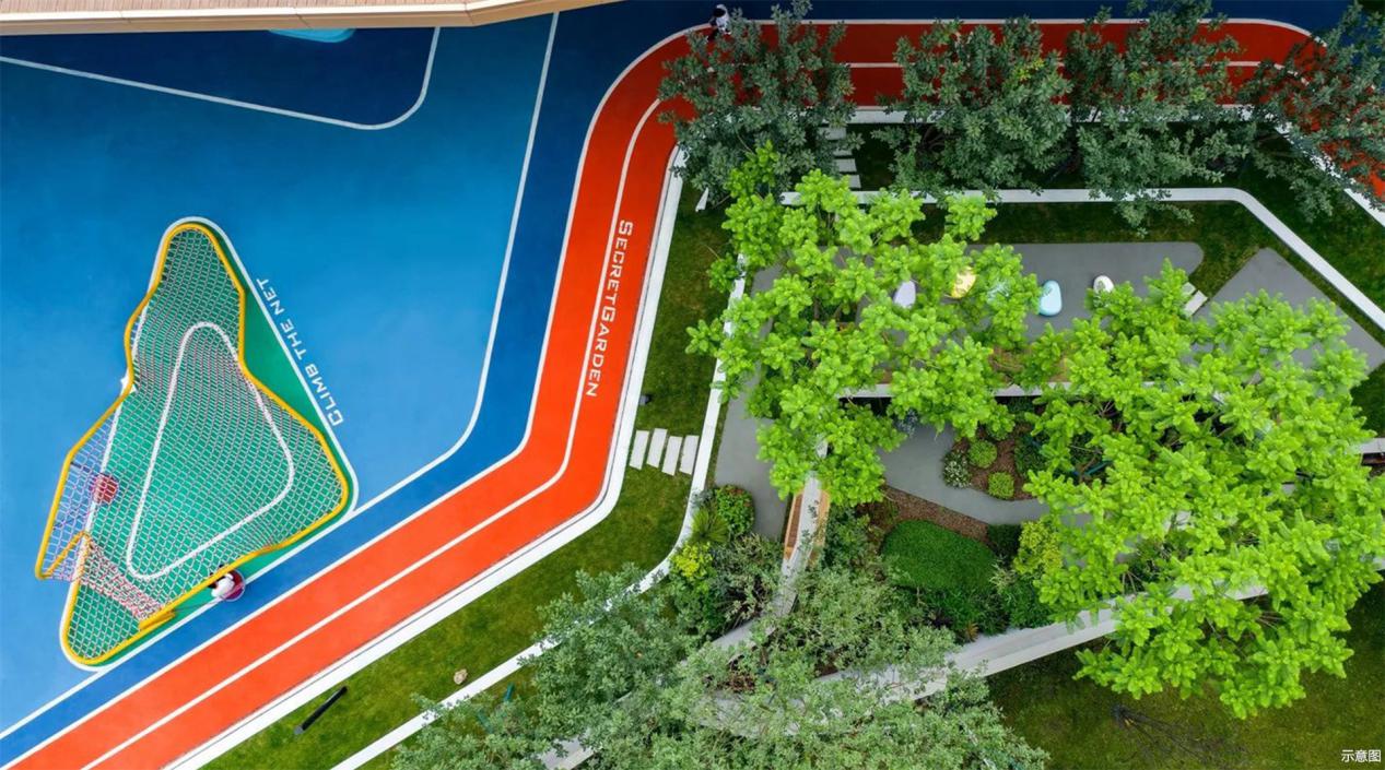 孩子们可以踏上彩虹跑道肆意奔跑,滑过穿梭滑梯到达架空层场地;在儿童戏水池中嬉戏;在自然的空间中寻找或动或静的乐趣……在探险玩乐中建立信心,为孩子构筑了一处功能完善的自然成长空间。