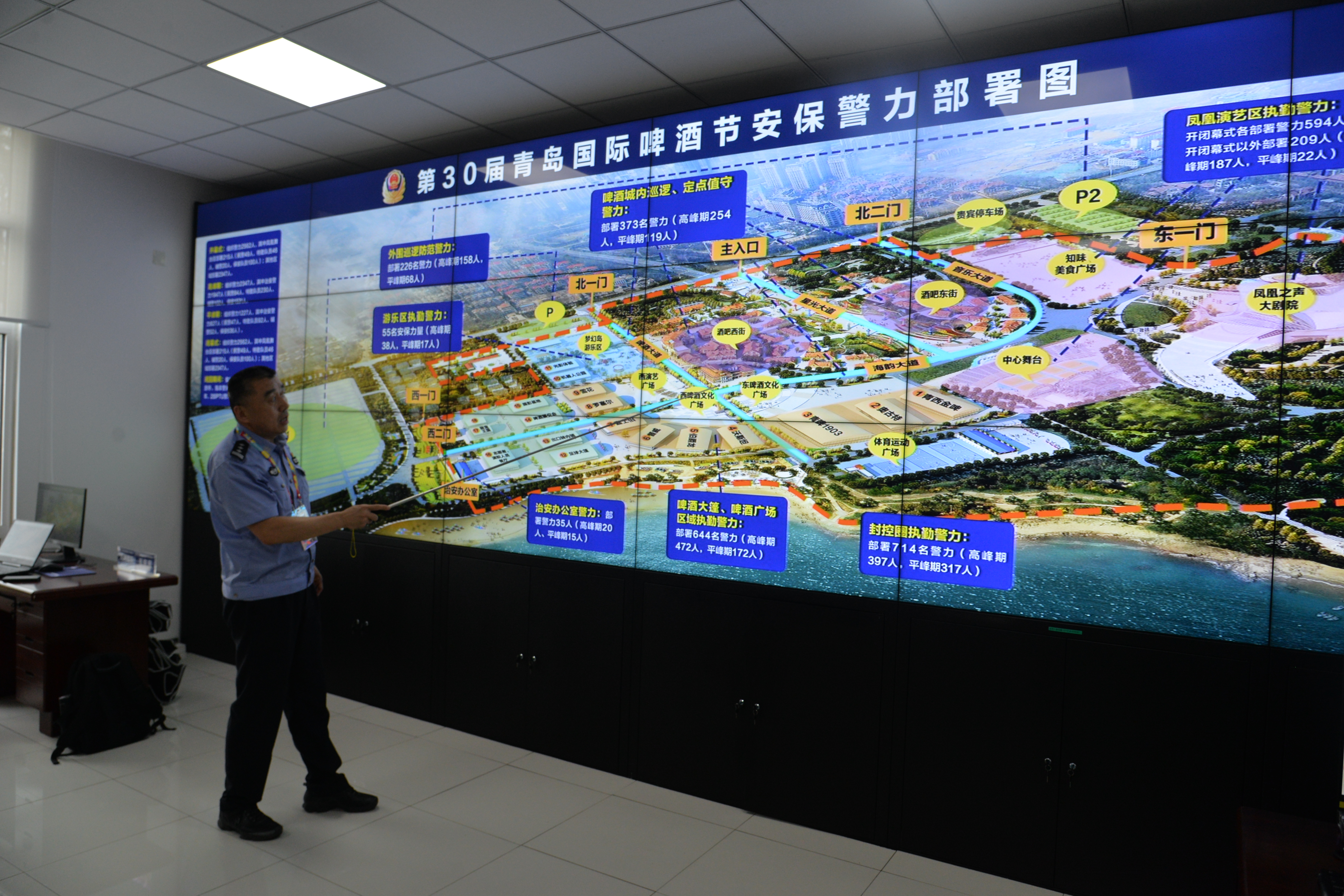 据了解,今年游客服务中心新增了LED大屏幕播放职能,园区内外的40余块LED大屏幕循环播放第30届青岛国际啤酒节宣传片、疫情防控信息等,此外啤酒节期间,还在金沙滩啤酒城的8个入口以及整个园区内,循环播放疫情防控须知,提醒市民游客做好疫情防护,合理佩戴口罩、安全聚餐等。