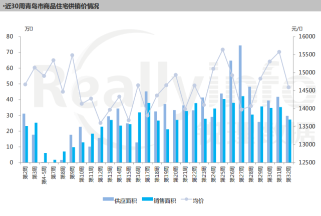 价格方面,上周(8.3-8.9),青岛全市商品住宅市场成交均价较上周下降,为14594元/㎡,环比下降6%。
