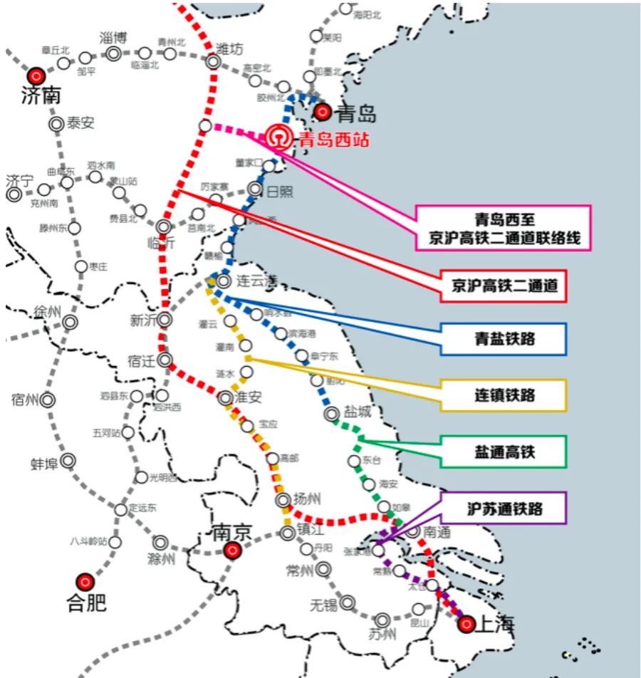 盐通、连镇两条铁路通车后,从青岛西站可直接通过青盐铁路、盐通高铁、沪苏通铁路、连镇铁路4小时通达上海、南京、苏州、扬州等长三角重点城市,两条铁路快速通道将不再经过青岛西至京沪高铁二通道联络线,成为京沪高铁的辅助通道。