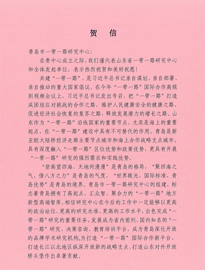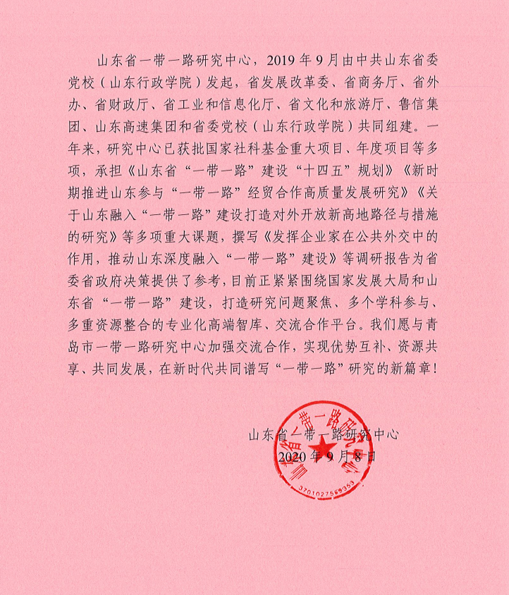 “研究中心的成立是‘一流党校’建设的标志性措施,标志着党校立足职能、围绕中心、服务大局,找到了有效的结合点、着力点,也标志着青岛拥有了高起点的‘一带一路’地方新型高端智库。”山东省委党校(山东行政学院)常务副校(院)长徐闻表示,希望研究中心能够发展成为省内前列、国内知名的“一带一路”研究、决策咨询、教育培训平台,为打造“一带一路”国际合作新平台、打造山东对外开放桥头堡作出积极贡献。