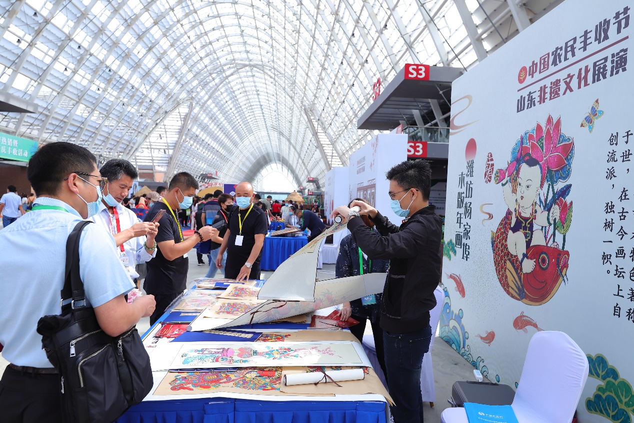 代表着山东省悠久的农耕文明和文化传承的非遗文化展演,同样获得了观众的一致好评。具有“形、色、声、动”四大独特效果的聂家庄泥塑,精细且兼具筋、韧、柔、软等特点的蓬莱小面,源于古代祭祀活动、迄今传承千年的胶东花饽饽,经由特殊手工艺制作而成的传统崂山茶,经过六道繁杂工序纯手工制作而成的锡镶工艺品,源于古代五谷祭祀活动、利用五谷杂粮拼粘而成的东明粮画,以“粗狂朴实、造型夸扩、构图饱满、色彩艳丽、对比强烈、图文并茂”等艺术特色著称的杨家埠木版年画,用竹子扎制骨架、高档丝绢蒙面、手工绘画制作而成的潍坊风筝,这八项非遗文化项目,以他们特有的方式展现了齐鲁地区的农耕文化和农业产业特色,并通过非遗传承人现场制作,彰显了黄河农耕文化的智慧与活力。