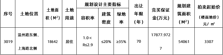 3019号地块:1、暂定竞得人须在网上土地拍卖结束后三个工作日内,与胶州市城市排水站签订《上海路污水泵站配建协议》,将该协议书与签订成交确认书需要的其他申请材料一并提交,作为竞得资格审查材料。2、竞买人须在网上报名开始日前向三里河街道办事处缴纳土地开发整理等相关费用人民币:2000万元。