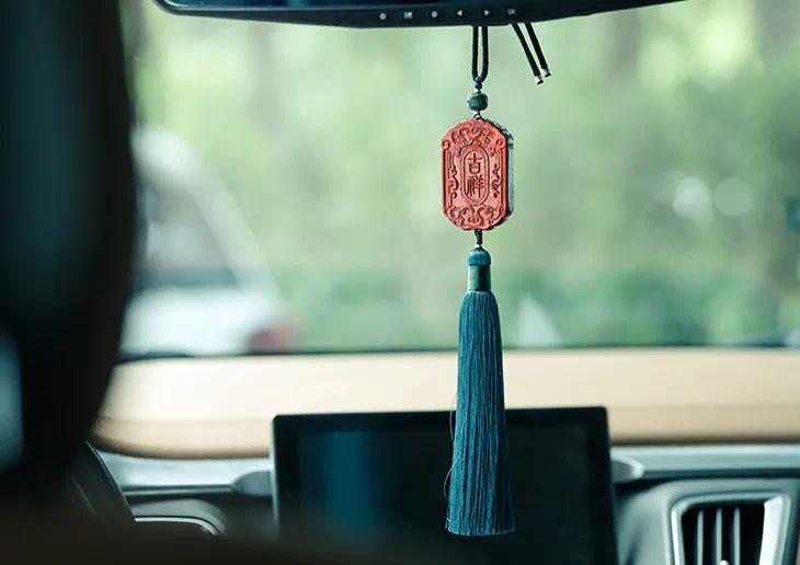 挂牌下方挂上青蓝色流苏,很有古典韵味;以925银四叶花收住编绳尾部,添细致感,挂于书案、车里,都显不俗品味。