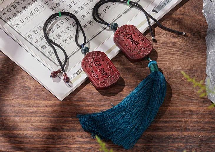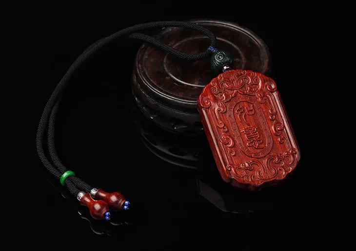 小叶紫檀做成的挂牌上,用小篆一面篆刻“吉祥”,一面篆刻“如意”,加以如意云纹等传统纹饰、阿拉善陨石点缀,祈愿你生活顺心幸福。