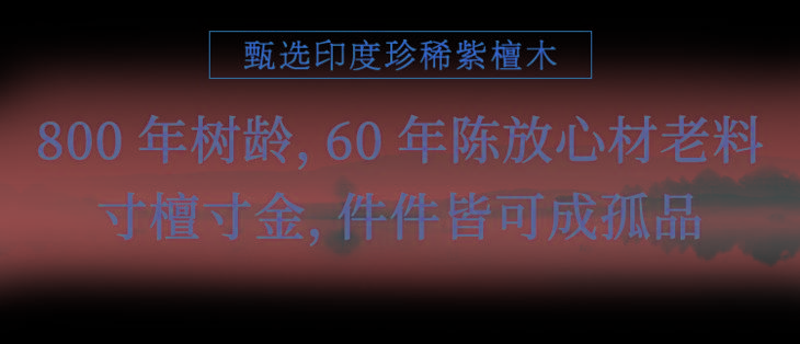为了更好的油润感、澄澈泛红紫光,他们特地选用800年树龄的紫檀木,陈放了60年以上的老料小叶紫檀,不可多得,收藏价值和升值空间颇为可观。