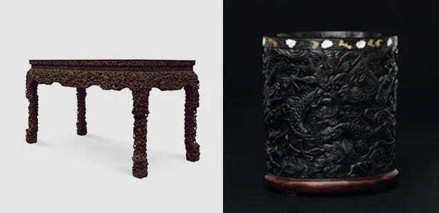 *左为清乾隆紫檀龙御案,右为明周制鱼龙兽紫檀笔筒