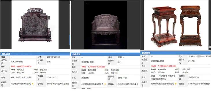 ○ 2013年,近代的小叶紫檀宝座,以高达109.25万成交;