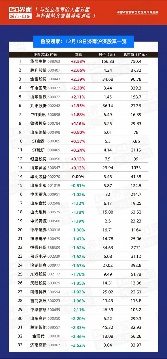 原标题:鲁股观察 | 12月18日:东诚药业跌幅居全省首位,全省88只个股上涨