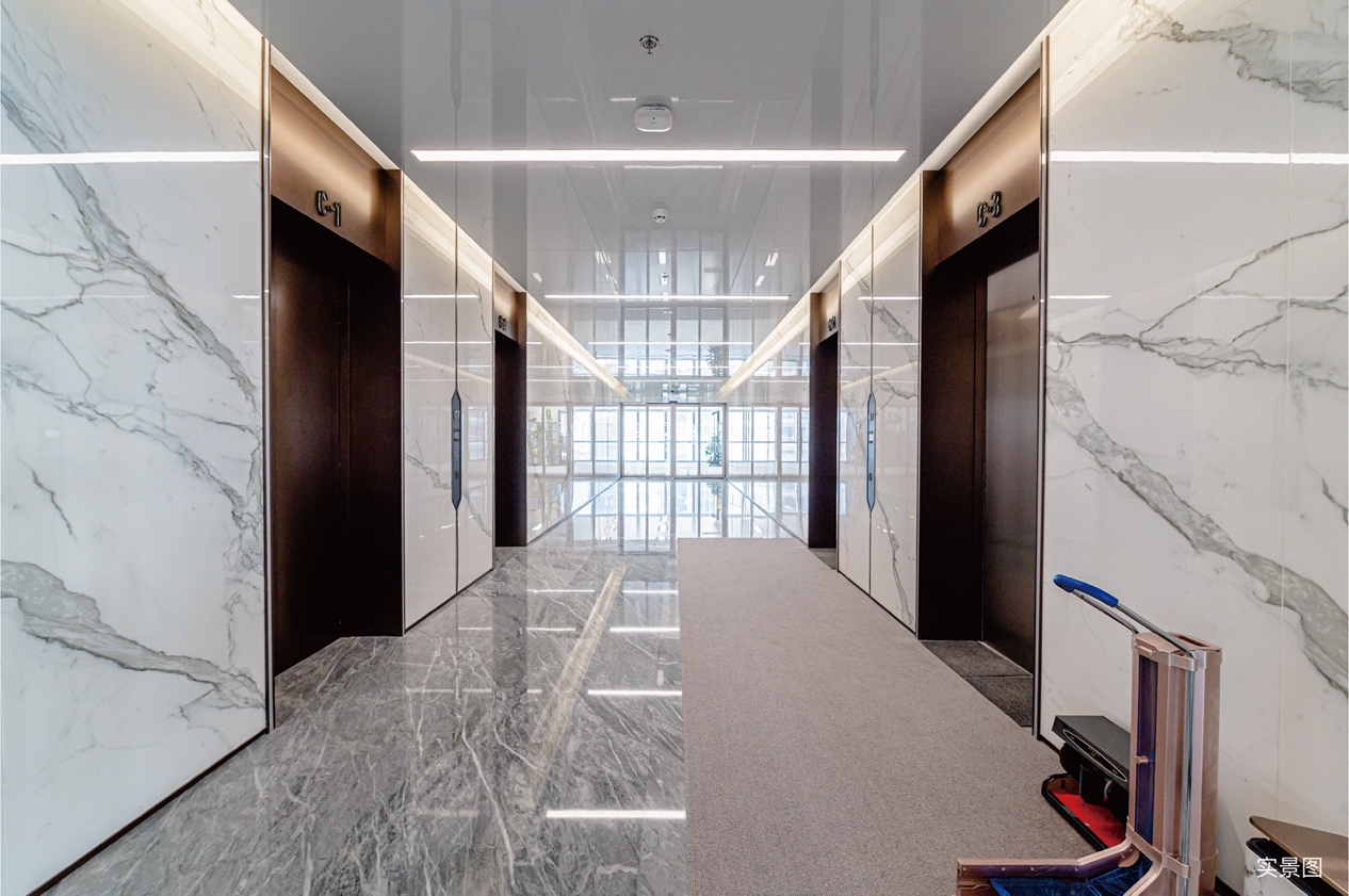 挑高大堂的设计,高级石材地面、艺术墙面、吊顶,让大厦的入户空间开阔、大方端庄。迈进大堂,宽阔卓绝的视野与清新的阳光不请自来,于此相融。