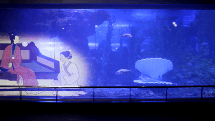 青岛海底世界中央表演大厅内,“海誓山盟”圆柱展缸与表演大屏幕遥相呼应,也为海底“梁祝”表演现场营造了浪漫缱绻的氛围。