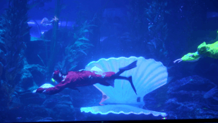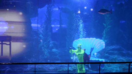 虽然观众看得精彩绝伦、意犹未尽,但海底世界的演员们为此可着实费了一番苦心。为了克服水底的浮力,让表演的过程中呈现出衣袂飘飘的绝美画面,除了身穿量身定制的演出服之外,他们还特意在身上绑上部分铅坠……而且每个动作都需要演员们深吸一口气,在没有呼吸设备辅助的情况下水下游动足足一分之久(66666)!~