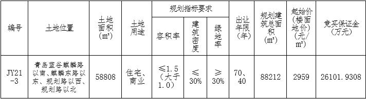 根据拍卖公告显示,编号JY21-3地块位于青岛蓝谷麒麟路以南、麒麟东路以东、规划路以西、规划路以北,规划用途为住宅、商业用地,地块占地面积58808㎡,规划建筑面积88212㎡,容积率1.5,地块起始楼板价2959元/㎡,起始总价2.61亿元。