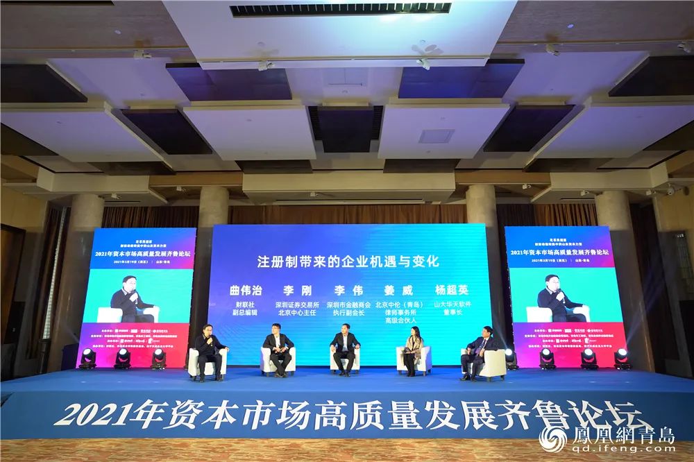围绕“注册制带来的企业机遇与变化”两大主题,论坛现场以圆桌对话的形式,深圳证券交易所北京中心主任李刚、财联社副总编辑曲伟治、深圳金融商会李伟、北京中伦(青岛)律师事务所高级合伙人姜威、山大华天软件董事长杨超英进行了探讨和交流。