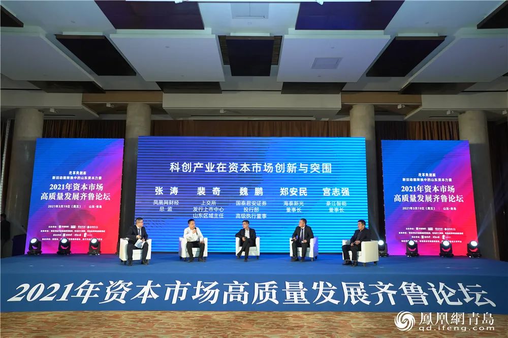 围绕“科创产业在资本市场创新与突围”一主题,凤凰网财经主编张涛、上交所发行上市中心山东区域主任裴奇、国泰君安证券执行部高级执行董事魏鹏、海泰新光董事长郑安民、泰讲智能董事长宫志强现场进行圆桌论坛对话。