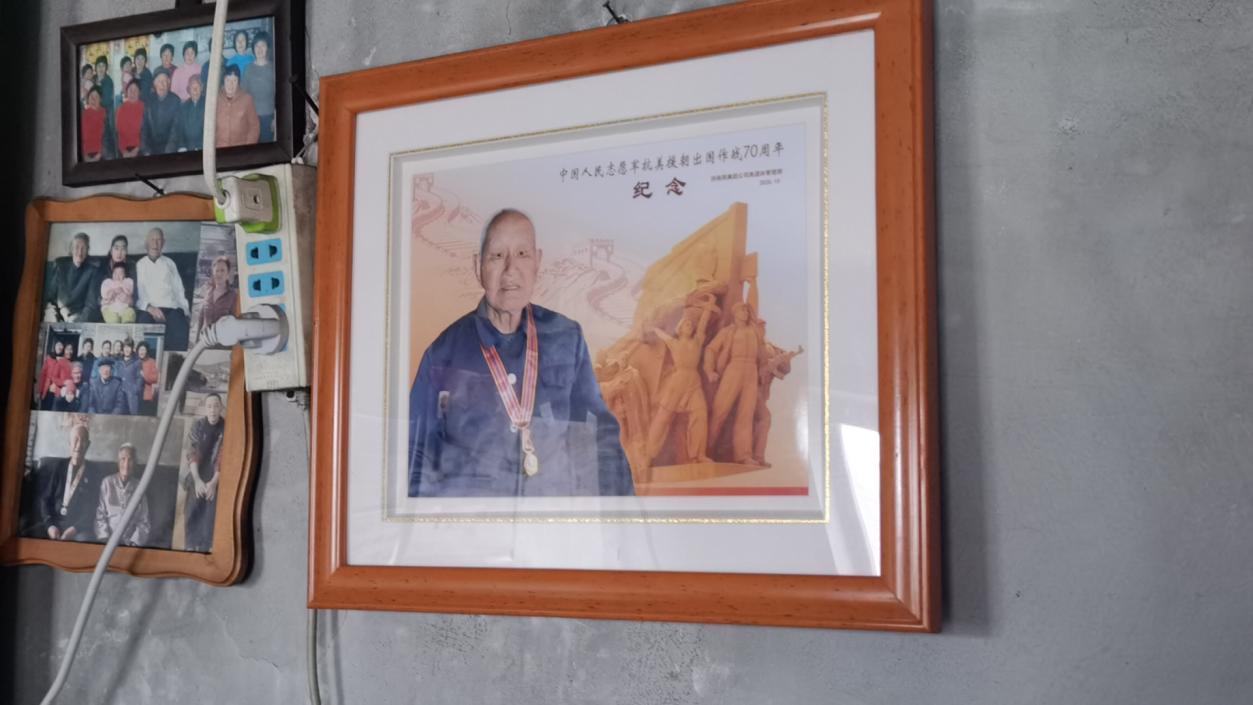 在参加过抗美援朝战争的张为希家中,我们看到了他在抗美援朝出国作战70周年的纪念照片。中建八局的青年们和老英雄围坐一堂、促膝而谈。据了解,张老先生1948年2月加入中国共产党,1947年参加了孟良崮战役、1952年参加了抗美援朝战争,如今已经94岁高龄,眼神依旧坚定、气概不减当年。