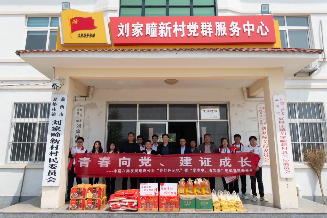 2021年4月25日,中建八局发展建设公司与青岛市派驻莱西市夏格庄镇乡村振兴工作队、夏格庄镇党委政府联合开展了“寻红色记忆”暨“学党史、走基层、办实事”走访慰问老党员活动。