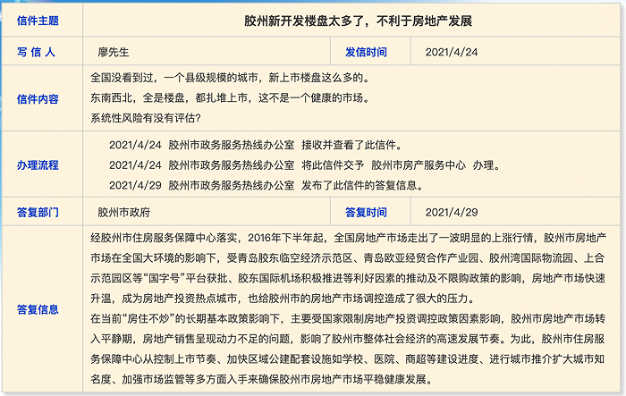 2021年4月29日,青岛政务网政府信箱中一则关于胶州房地产市场问题的来信收到了来自胶州市政府的回复。在这则回复中,胶州市政府不仅对当下胶州房地产市场的情况进行了解答,还罕见地直接承认了胶州当下房地产销售动力不足的问题。