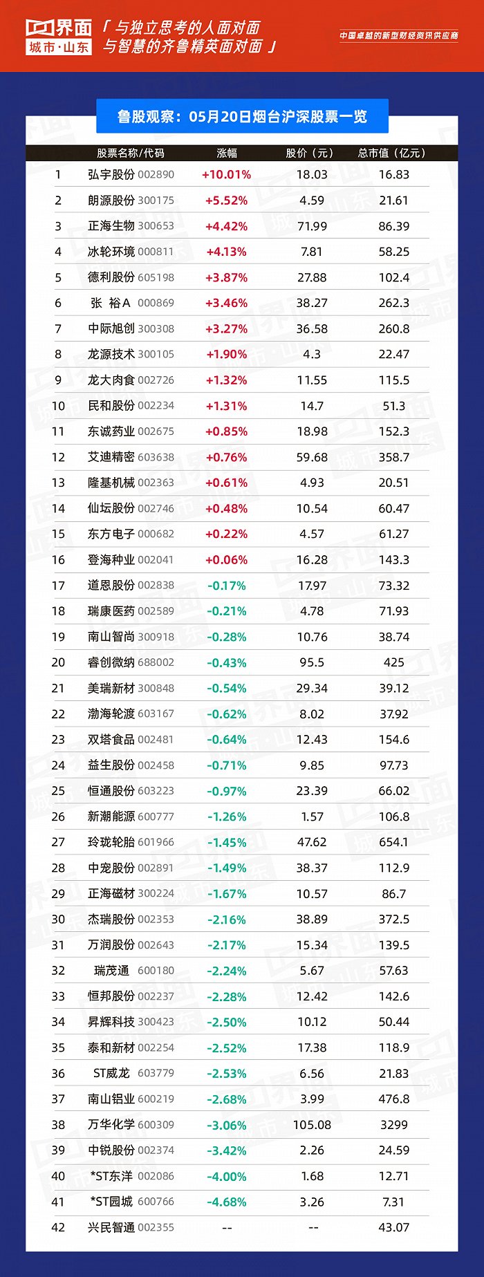 烟台市涨幅榜首:弘宇股份(002890),涨幅10.01%,股价18.03元,总市值16.83亿元;