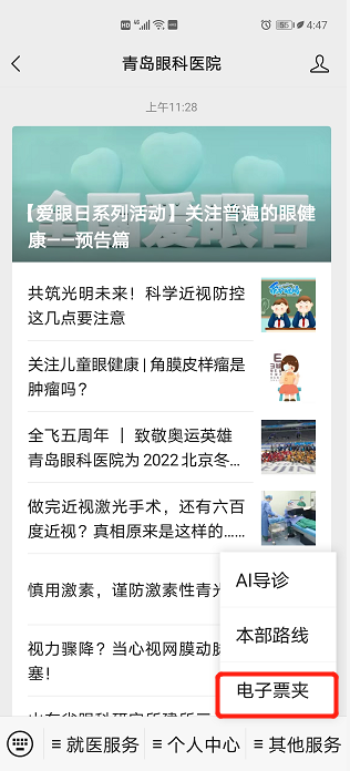 “发票已经开好了,您在‘电子票夹’中就可以查看了。”李女士在青岛眼科医院挂号处工作人员的帮助下在小程序里找到了今天检查项目的所有发票,十分惊喜:“以前开发票的时候都是每个项目一张发票,一次检查就能开出厚厚的一沓来,办手续的时候要拿着一堆发票,既不方便也不环保,现在能直接在手机里导出真是太方便了!”