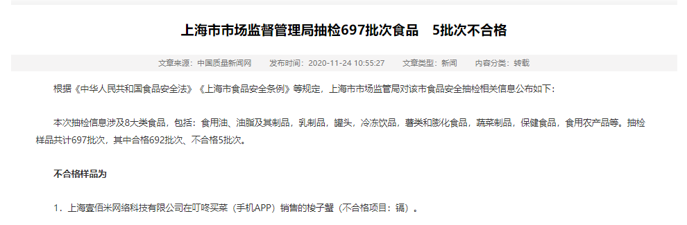 根据《中华人民共和国食品安全法》《上海市食品安全条例》等规定,上海市市场监管局对该市食品安全抽检相关信息中发现,上海壹佰米网络科技有限公司在叮咚买菜(手机APP)销售的梭子蟹(不合格项目:镉)。
