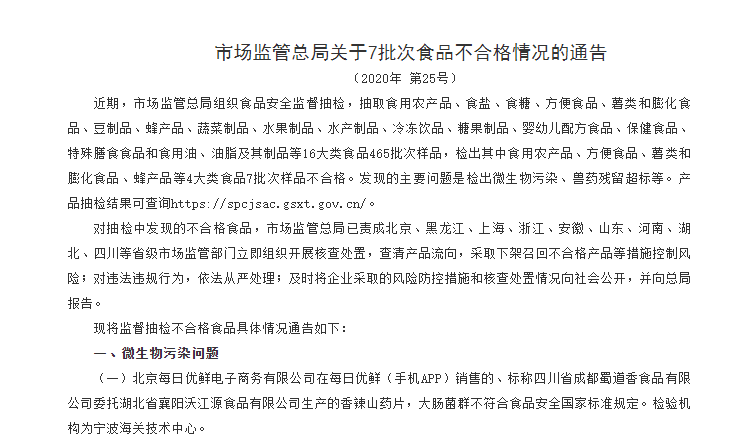 国家市场监督管理总局官网显示,在2020年市场监管总局关于7批次食品不合格情况的通告中,北京每日优鲜电子商务有限公司在每日优鲜(手机APP)销售的、标称四川省成都蜀道香食品有限公司委托湖北省襄阳沃江源食品有限公司生产的香辣山药片,大肠菌群不符合食品安全国家标准规定。检验机构为宁波海关技术中心。