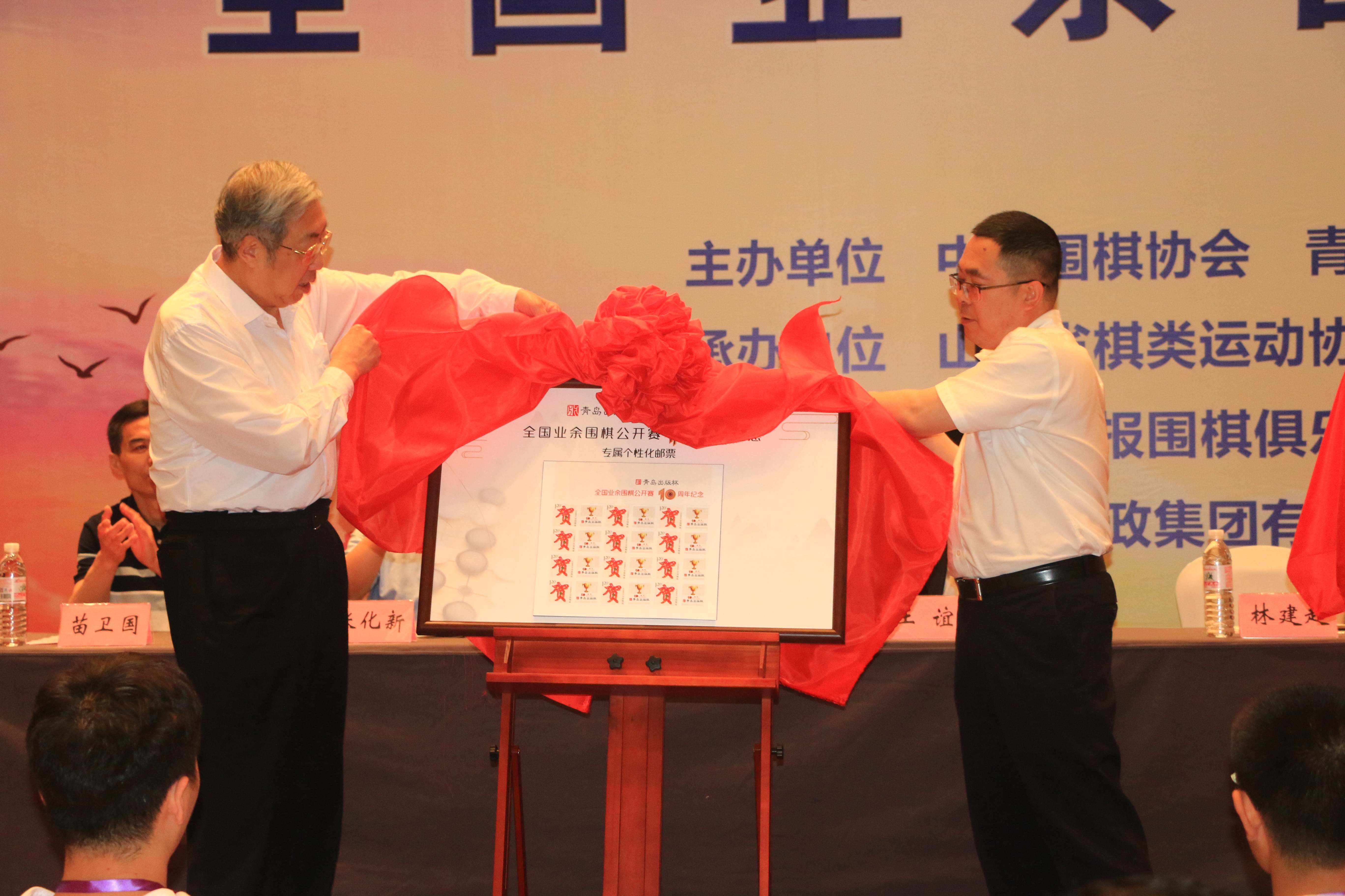 为纪念“青岛出版杯”开赛十周年,青岛出版集团联合中国邮政集团,定制了“青岛出版杯”十周年个性化专属邮票、明信片和纪念封。活动现场,中国围棋协会主席林建超、青岛出版集团党委书记、董事长王为达共同为纪念邮票、明信片和纪念封进行了揭幕。
