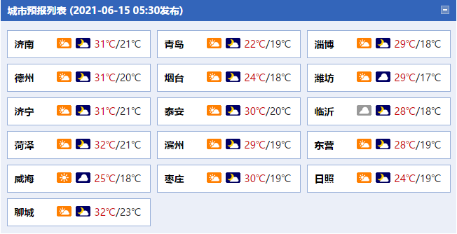最高气温:鲁东南沿海和半岛南部沿海地区21℃左右,其他地区26℃左右。