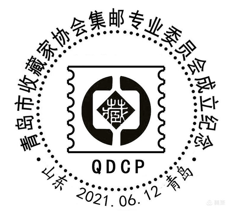 纪念戳图案则简明扼要,在“青岛市收藏家协会集邮专业委员会成立纪念”主题词围成的圆内,以带有邮票齿孔的平面,镌有中国收藏家协会会徽,“QDCP”字母是“青岛市收藏家协会集邮专业委员会”的英文缩写。