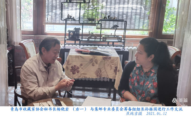集邮专业委员会副主任汪心杰(左)与协会秘书长杨晓岩交流收藏邮品。
