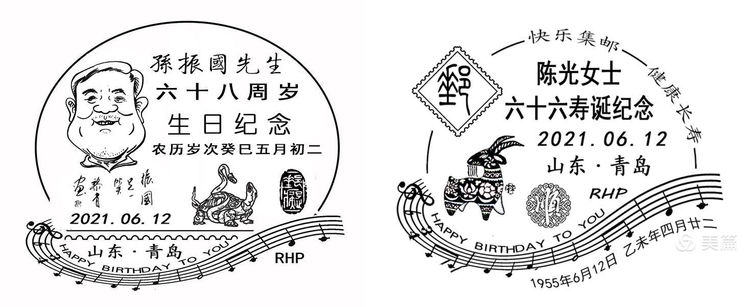 青岛市收藏家协会集邮专业委员会成立之日,适逢孙振国、陈光两位会员寿诞纪念日。按照该会为会员庆生寄发专门印制、由著名邮品艺术家任怀平先生设计的生日纪念封做法,是日,集邮专业委员会向两位会员寄出了生日纪念封,并加盖了任怀平先生为其设计的生日纪念戳以致敬贺。