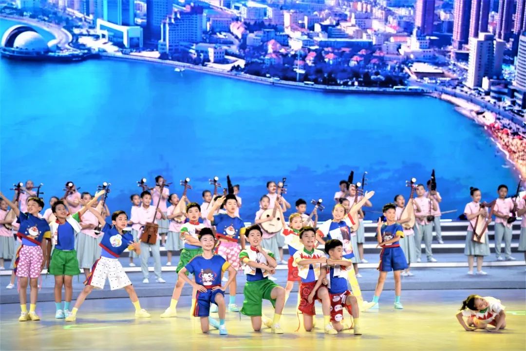 优美的旋律,孩子们纯真的笑容,动感的舞步,伴随着可爱的飞鱼和水母等高科技舞美手段,30名学生代表中国少年儿童精彩演绎了青岛城市宣传曲《青岛 青岛》。视觉呈现出大美青岛,活力少年、时尚岛城的预期效果。