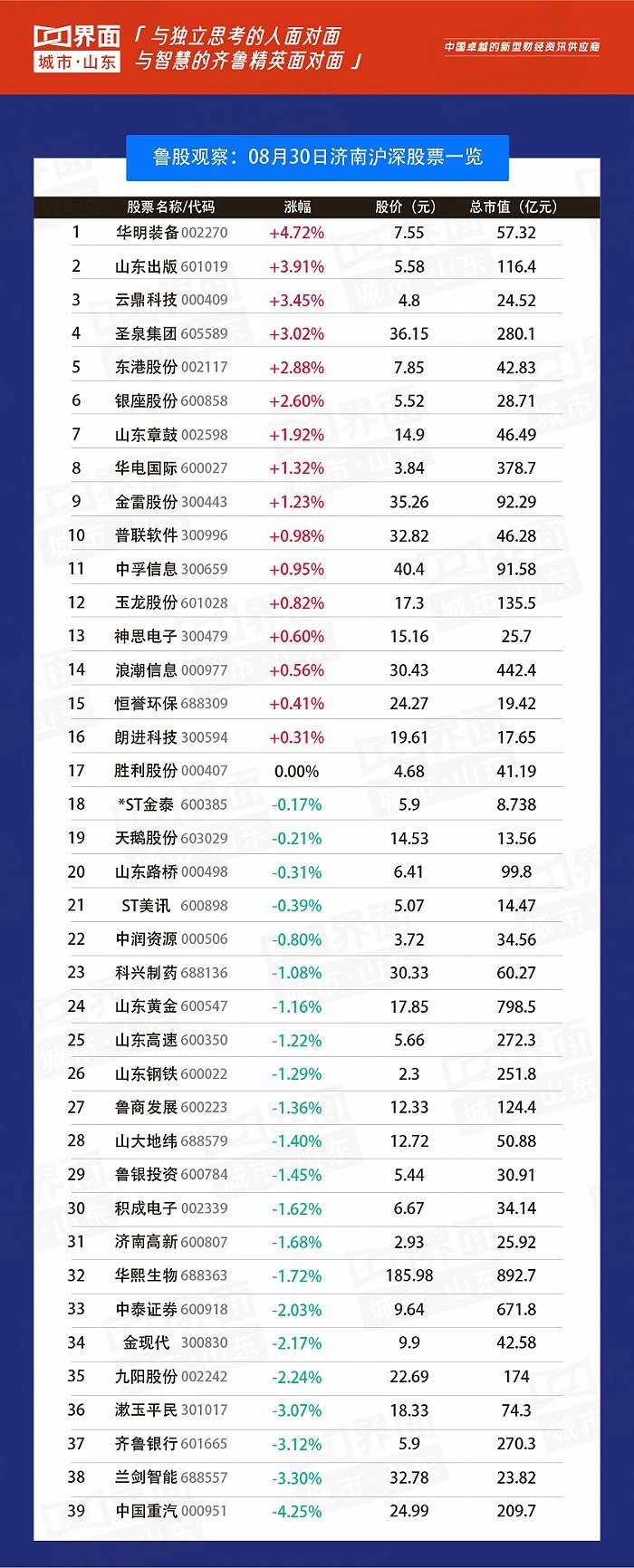 8月30日,山东108股上涨,5股持平,138股下跌。
