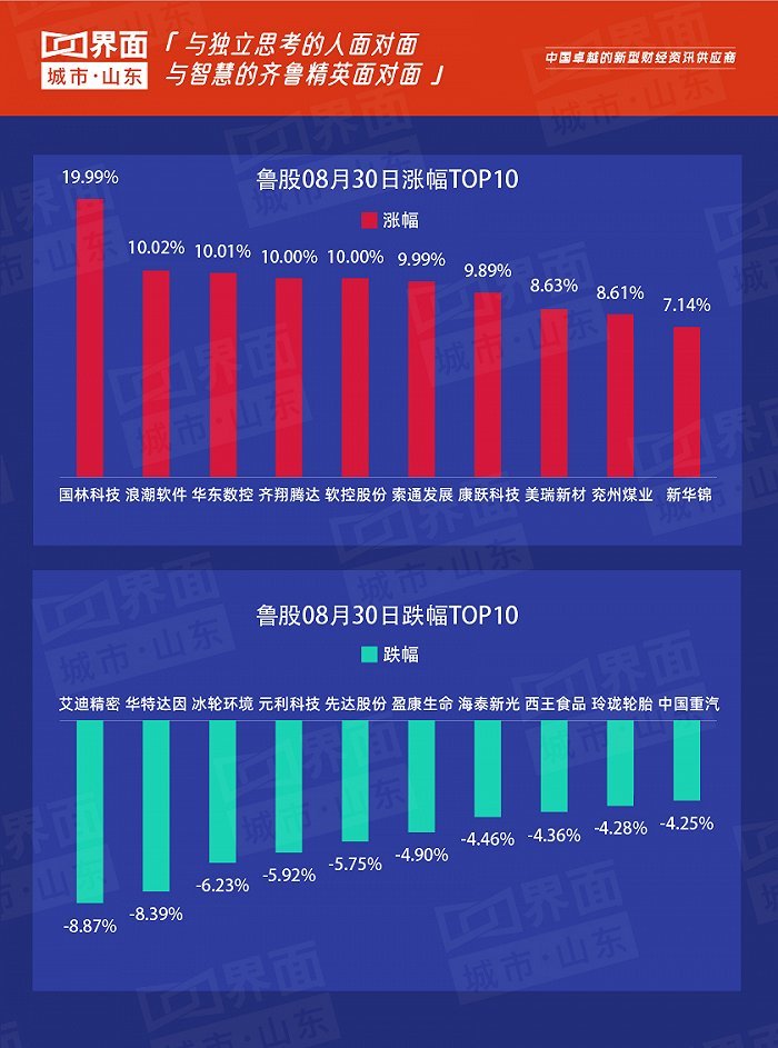 原标题:鲁股观察 |8月30日:山东108只个股上涨,国林科技以19.9%涨幅领涨全省