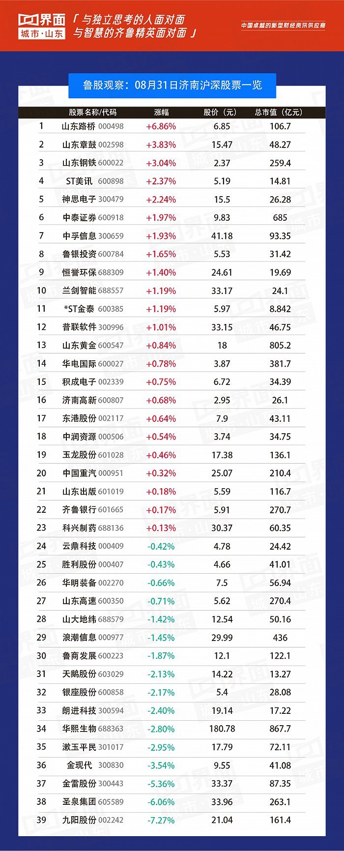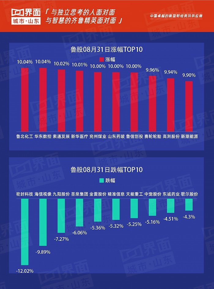 原标题:鲁股观察 | 8月31日: 126只个股上涨,鲁北化工领涨全省