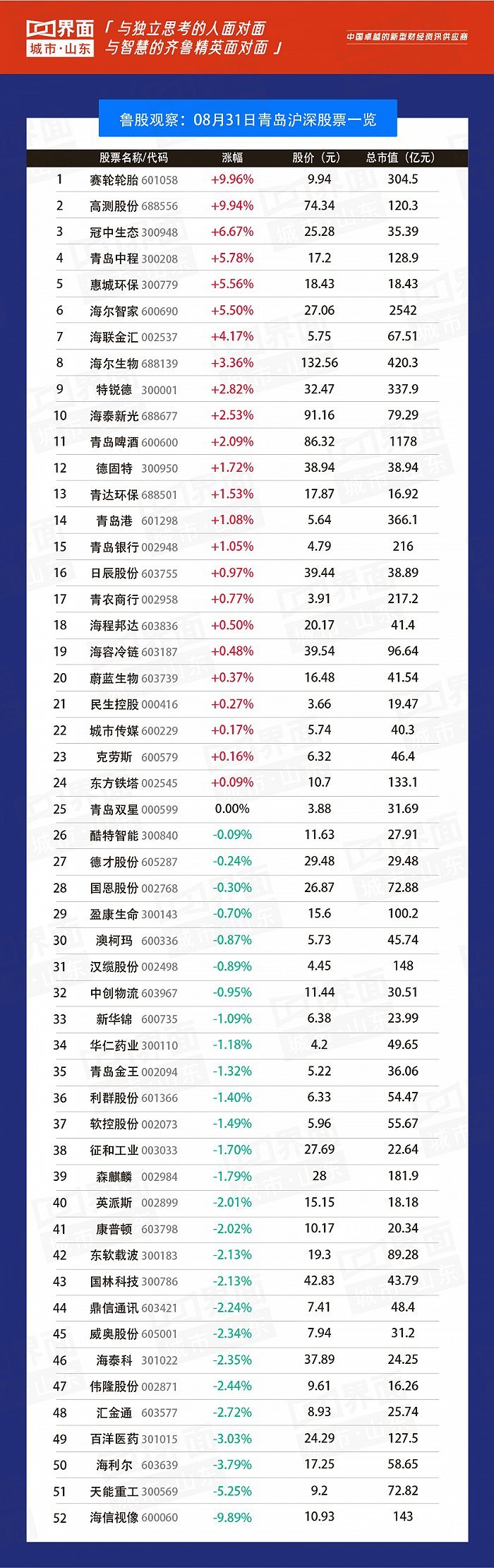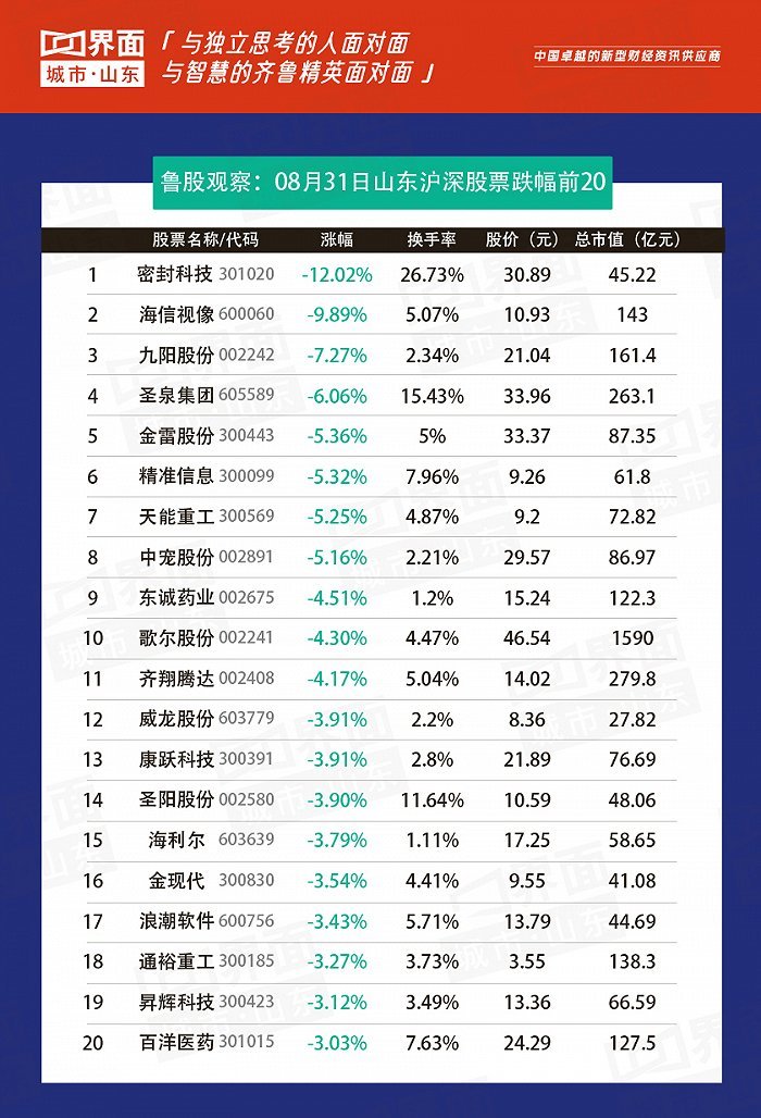 8月31日,山东126股上涨,3股持平,122股下跌。