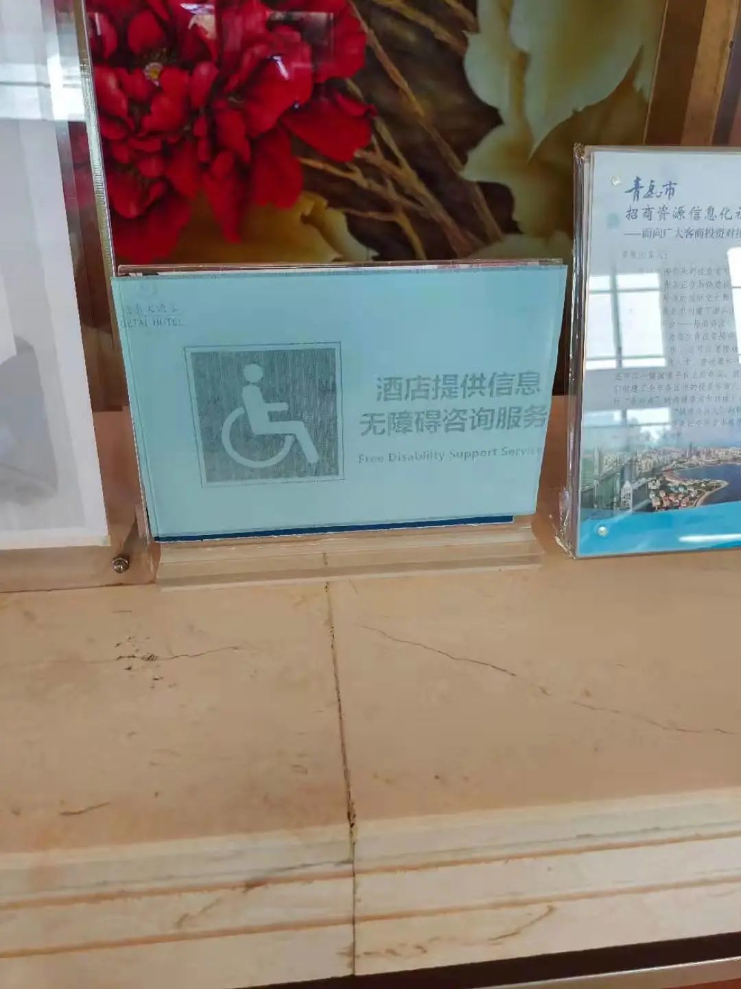 ↑关注残障人士的社会参与感,持续加大无障碍设施的投入力度。酒店设置有残疾人卫生间,残疾人厕位,残疾人停车位,电梯盲文,轮椅免费租借。