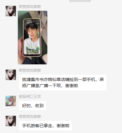 ↓姚蒙蒙,在园区捡到手机后,立即反馈信息联系广播室,积极寻找失主。