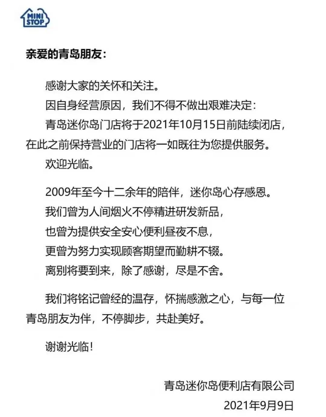 9月9日,青岛迷你岛在官方微博账号“青岛迷你岛Ministop”发布消息,称“因自身经营原因”,青岛迷你岛门店将于上述日期前陆续闭店。这一微博的发布,为在青经营十余年的迷你岛便利店迎来了整体的闭店倒计时。