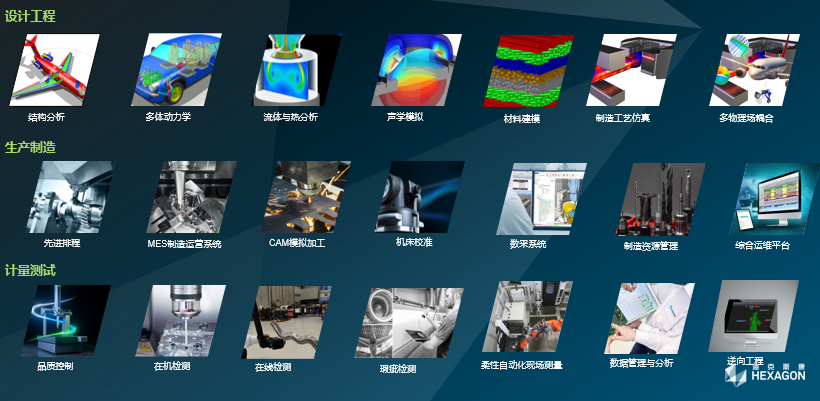 借助自主研发和过去20年近300家全球领先技术公司的并购,海克斯康构建了越来越完整的数字信息技术系列产品,可为客户提供贯穿设计工程、生产制造、计量测试等领域的专业技术、产品与解决方案。例如,在设计工程方面,海克斯康提供了先进的结构分析和多物理场模拟仿真工具;在生产制造方面,海克斯康涵盖、加工编程、加工模拟,到工厂自动化的CAD/CAM软件组合,还提供MES、机床校准等系统;在计量测试方面,海克斯康拥有各种类型的测量设备和传感、软件技术,从手动测量工具到应用于精密计量领域的超高精度测量机,从在机检测、在线自动化检测到利用大数据分析技术实现产品全生命周期的数据挖掘、分析与决策等。