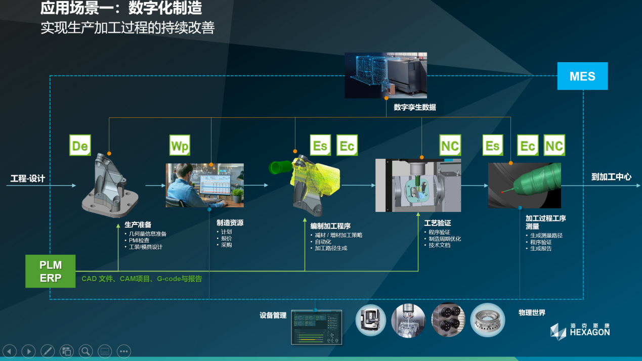 例如,在数字化制造方面,海克斯康打造了完整的解决方案,覆盖生产数据准备、制造资源排程、数控加工程序编制、工艺验证、机床代码的验证、加工过程工序测量等环节,并可与PLM/ERP等第三方数据与方案协同。通过面向数控加工工艺的数字主线,企业可以与物理世界的数字孪生数据进行了集成,同时,还可与MES系统实现协同,通过设备监控以及数据分析反馈实现迭代,实现生产加工过程的持续改善。