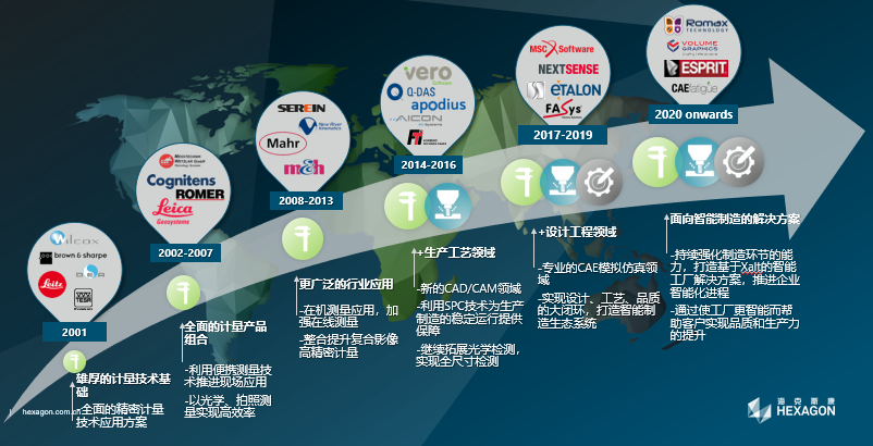智能制造是海克斯康的核心产业之一。在过去20多年里,海克斯康持续打造其面向制造业数字化转型的技术组合。自2000年开始,海克斯康基于雄厚的计量技术基础与经验,不断拓展计量测试技术应用的深度与广度,形成了全面的精密计量技术应用方案与系列产品;2010年后,公司启动工业软件驱动发展战略,围绕生产工艺、设计工程领域先后并购了全球知名的CAD/CAM软件公司Vero、享誉全球的质量大数据分析软件公司Q-DAS、CAE领域的鼻祖MSC软件、著名的CAD软件公司Bricsys、工业CT软件行业市场领导者Volume Graphic、全球领先的工程技术咨询及仿真软件公司Romax、设备校准方案提供商Etalon……。